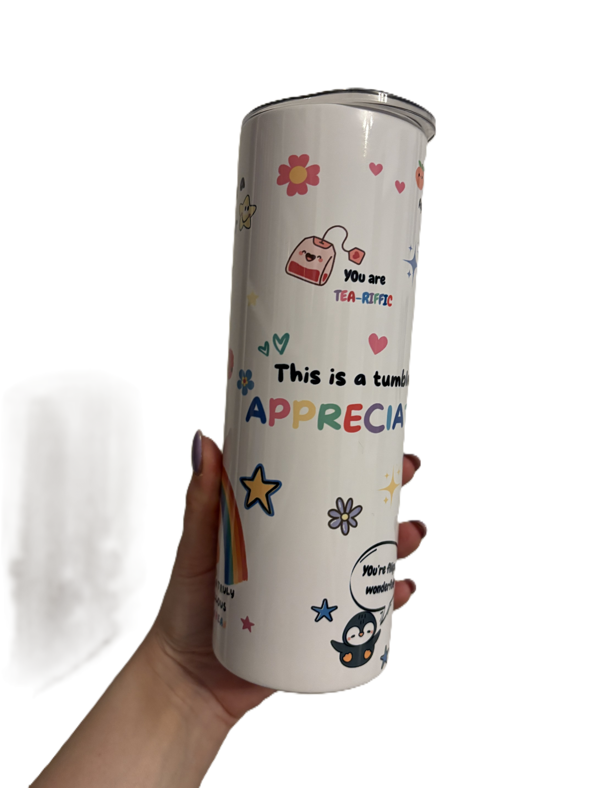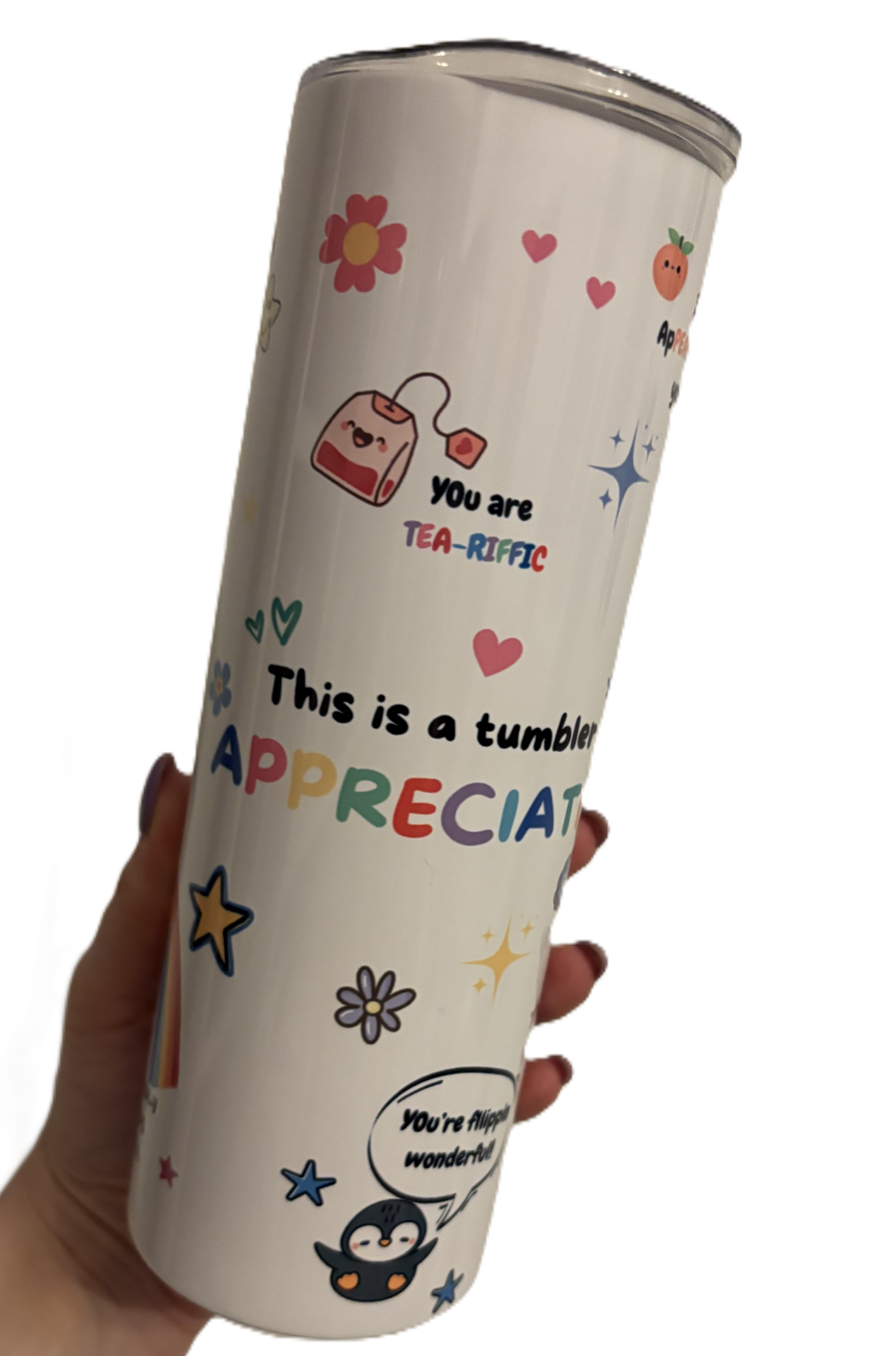 Sip in style and spread good vibes with our generous 20oz "Variations of Appreciation" Tumbler. This isn't just a drink holder; it's a daily reminder of gratitude, adorned with heartfelt phrases that celebrate all the wonderful ways people make a difference.