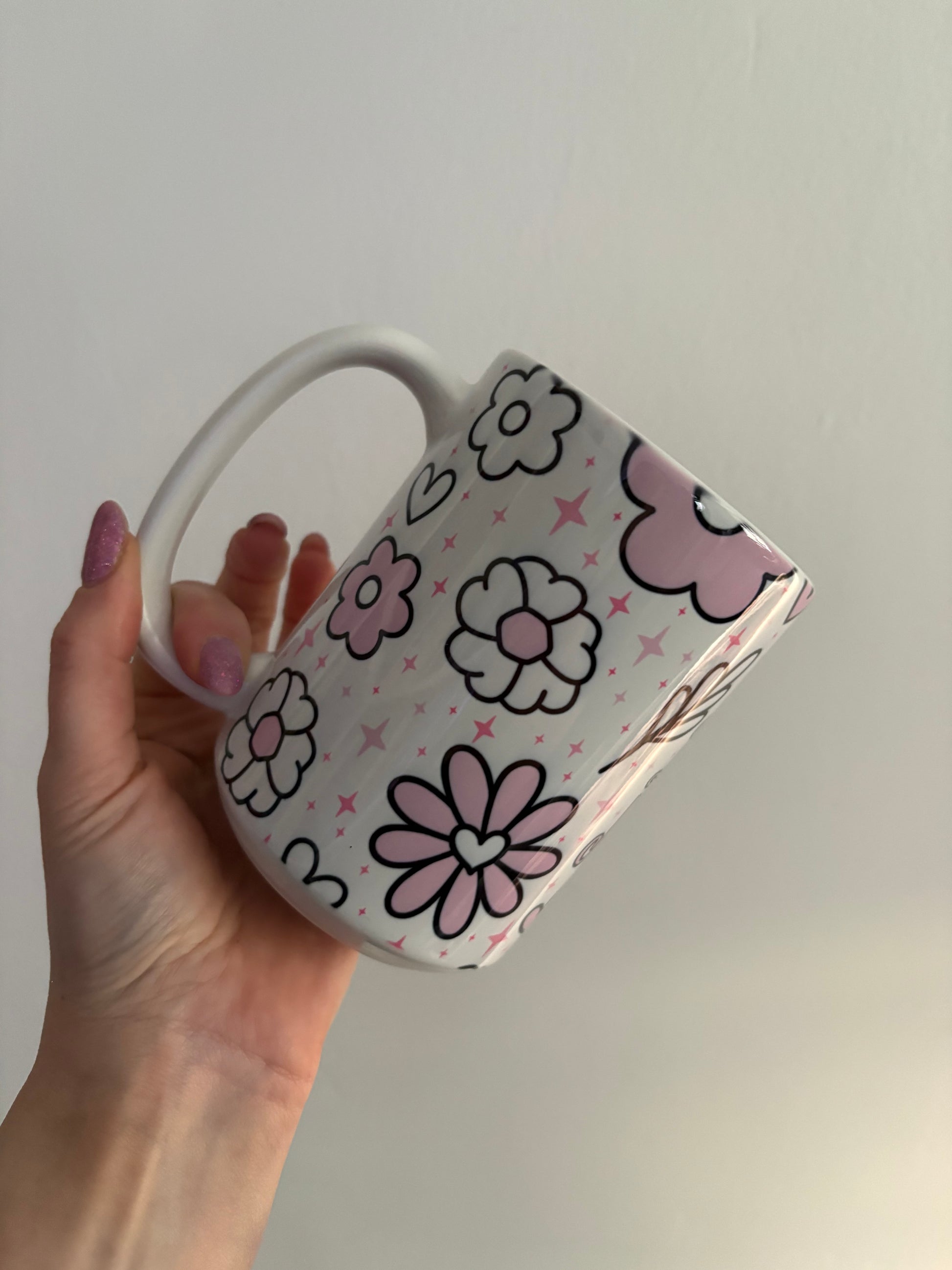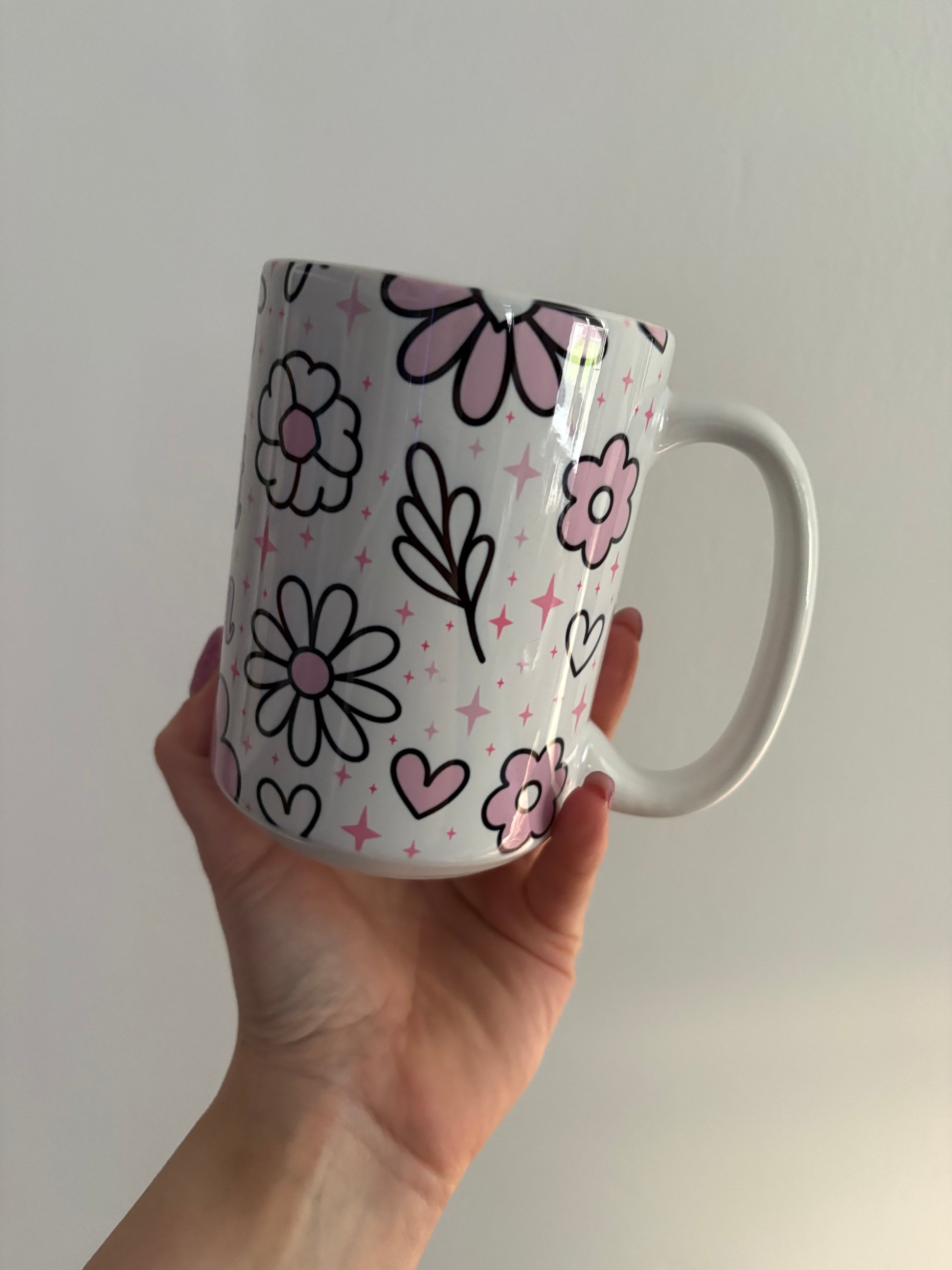This 15oz mug features a generously sized handle and displays a visually appealing design that articulates "best mum" alongside pink floral elements and star motifs.