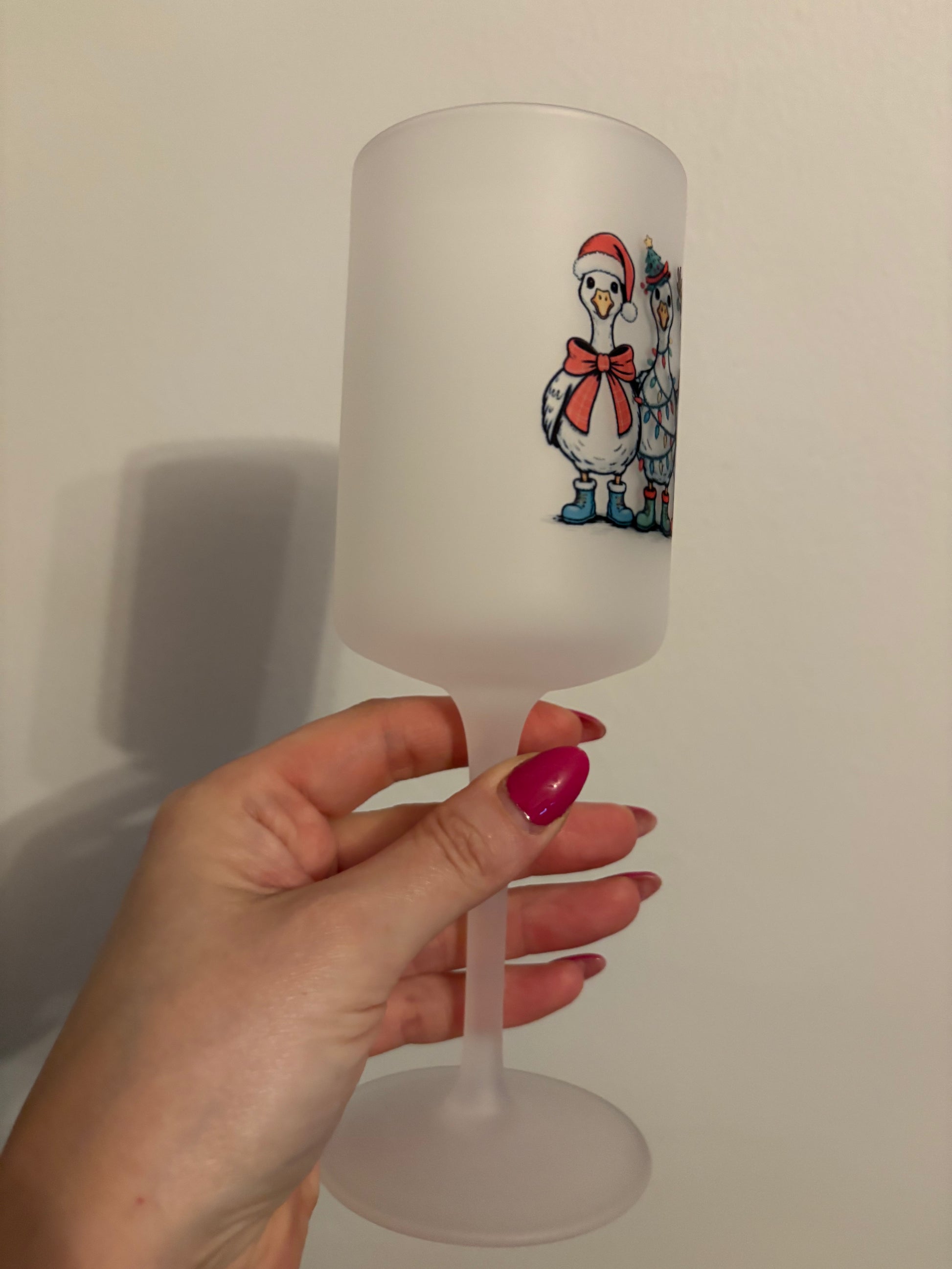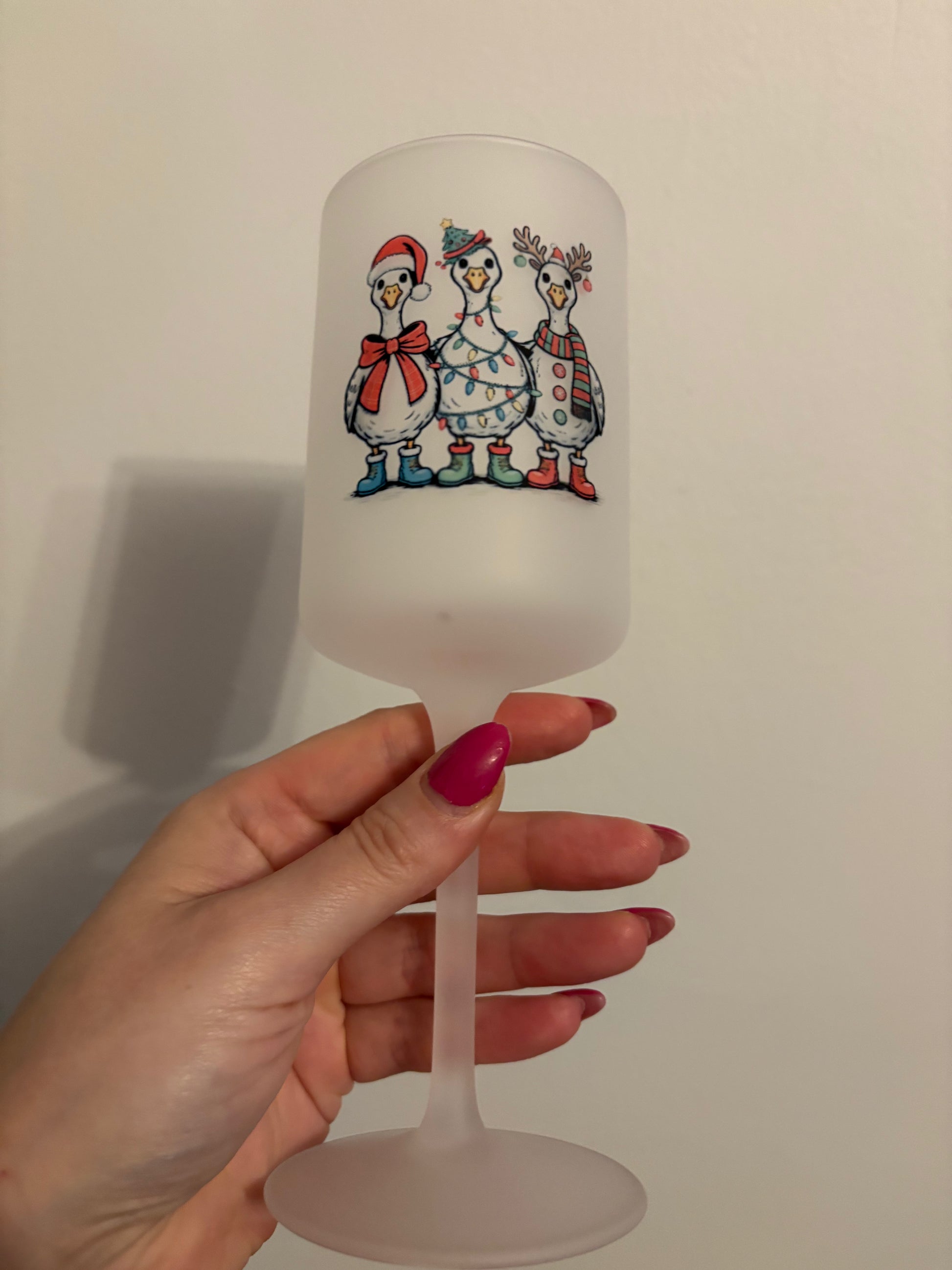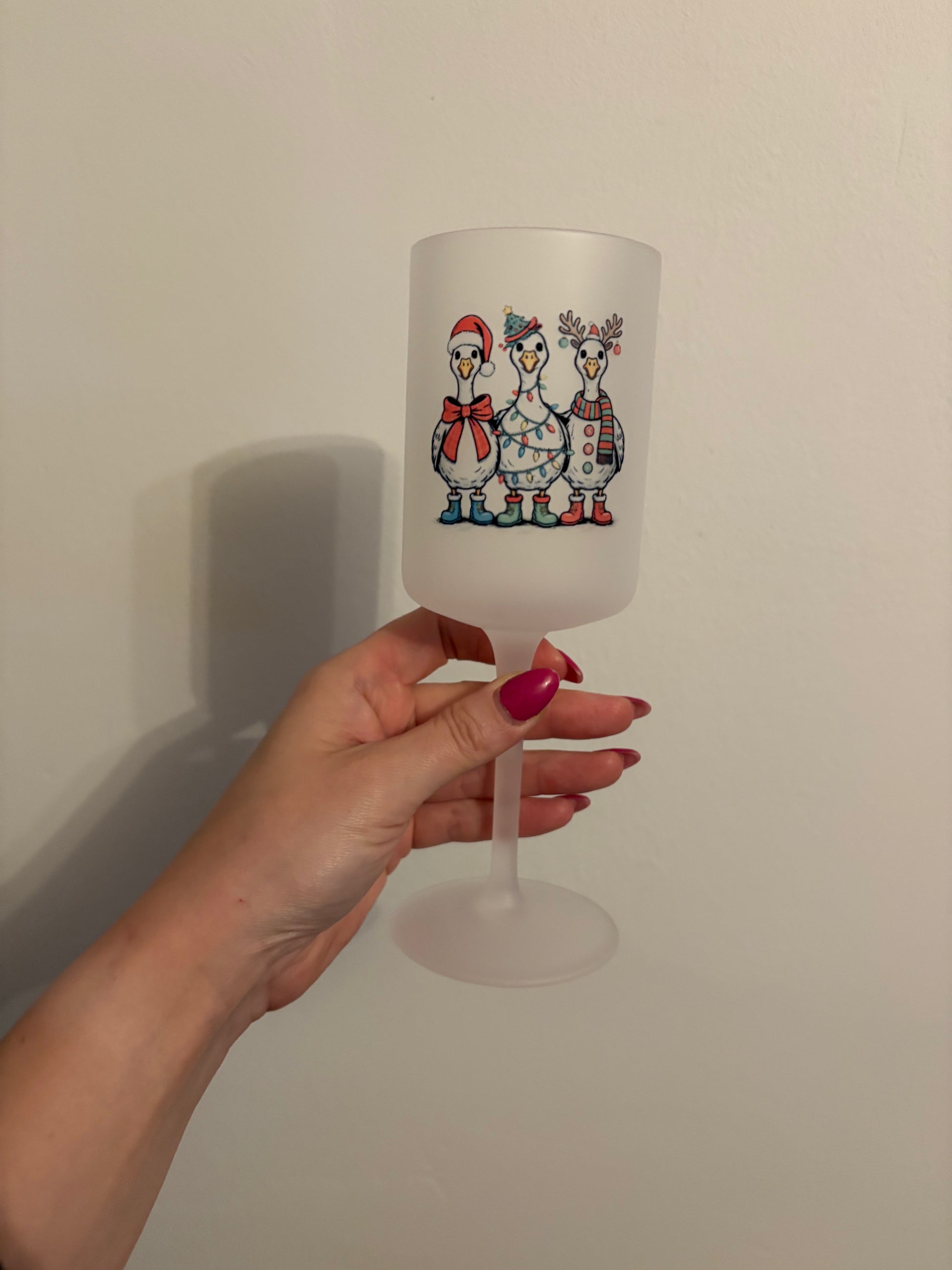 Raise a toast to good times with this generously sized wine glass, with festive geese. Perfect for those evenings when one glass is all you need... or perhaps a few! A fun and functional addition to any wine lover's collection, ensuring your sips are always in good spirits.