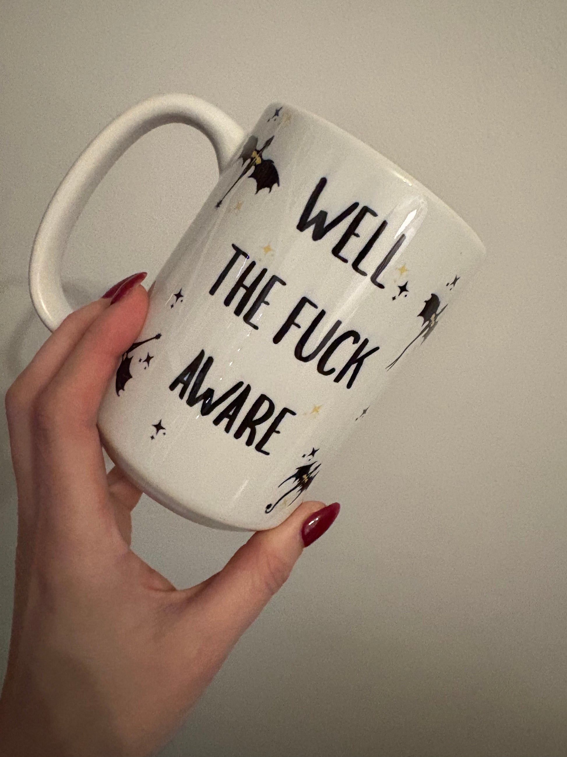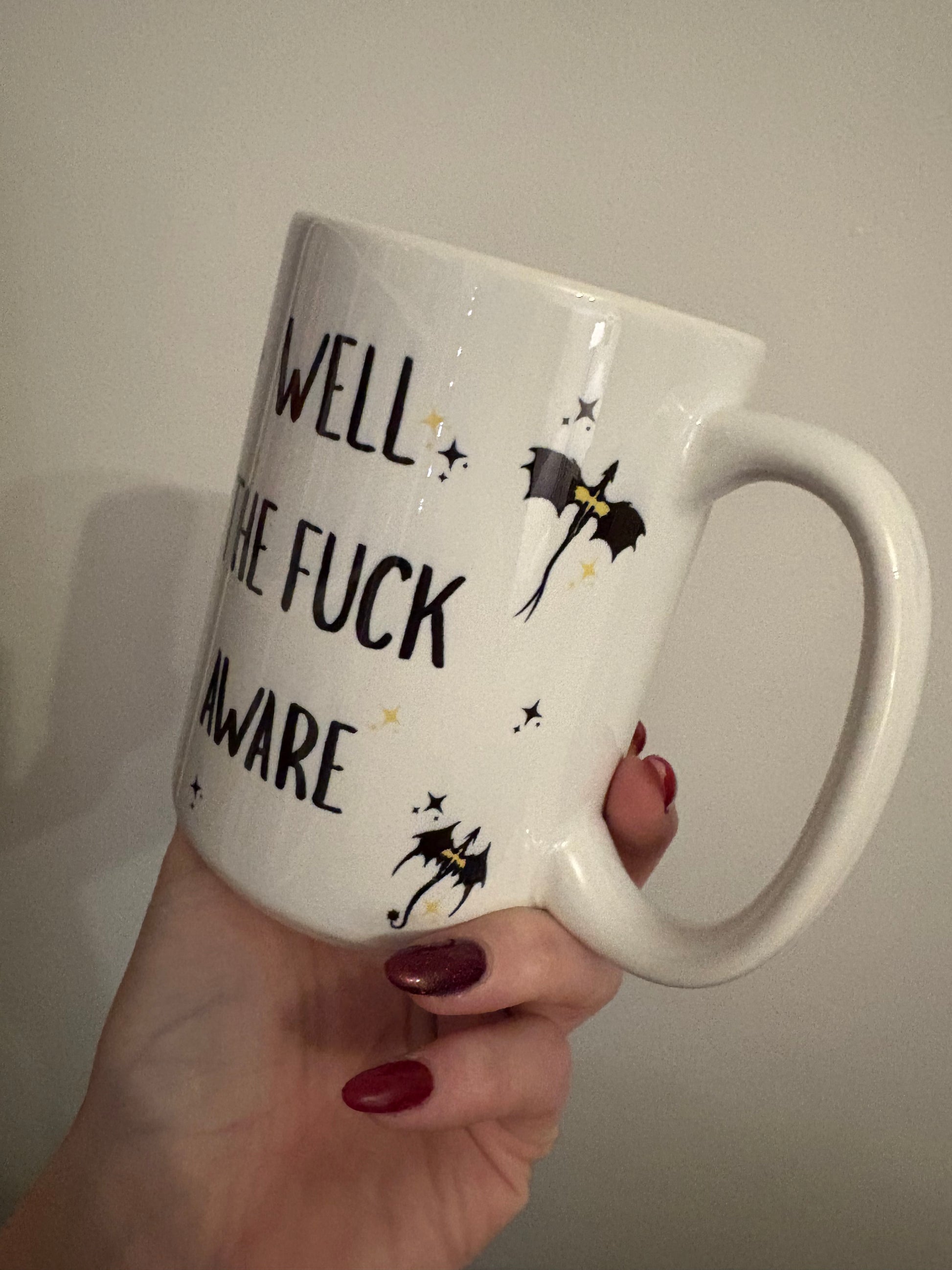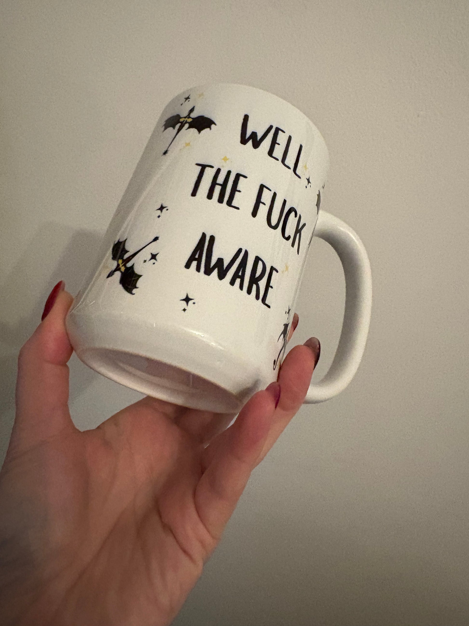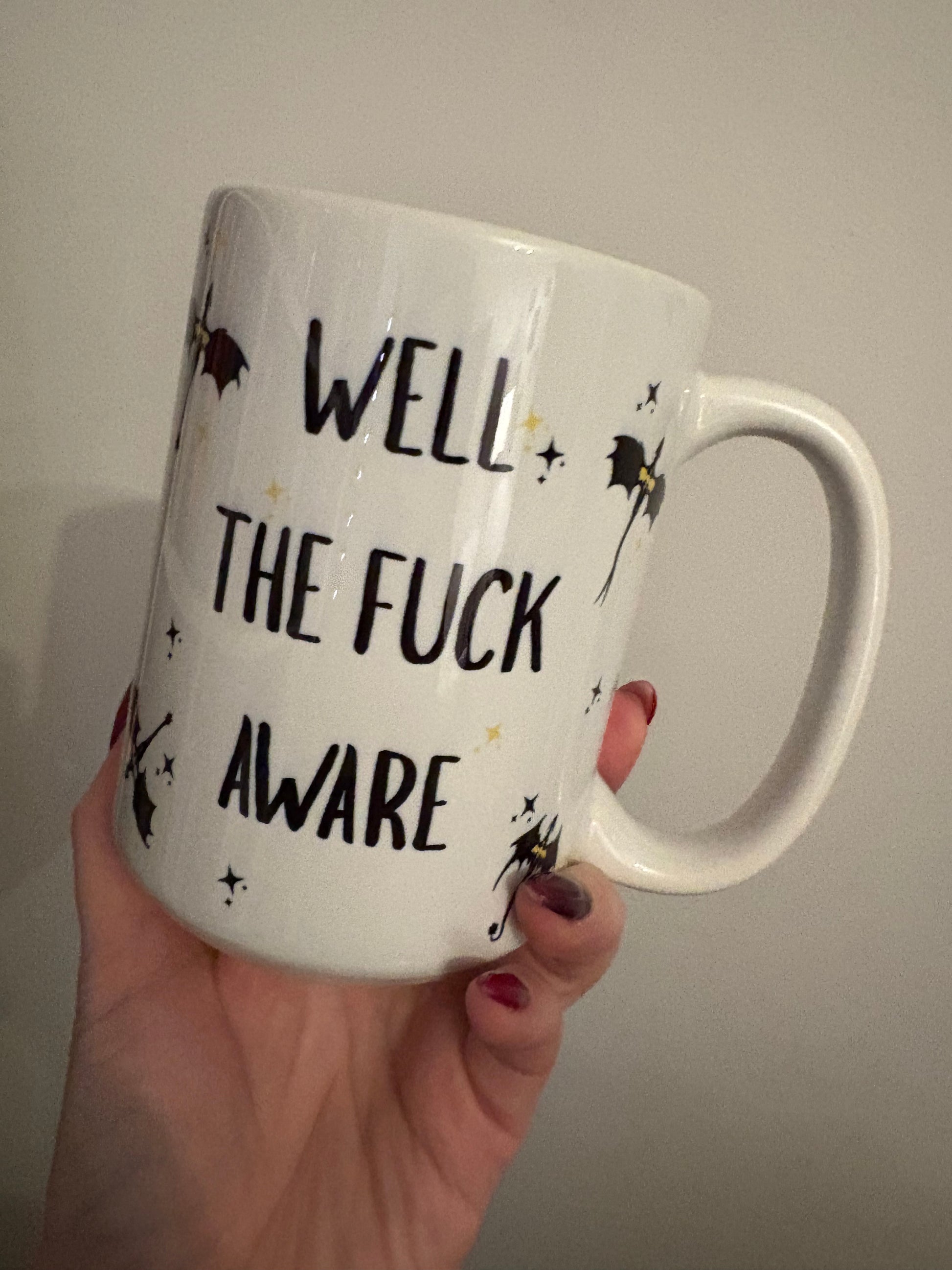 Start your day with the fierce attitude of a Basgiath student! This oversized 15 oz ceramic mug features the iconic, no-nonsense phrase from the Fourth Wing series: "Well the fuck aware."