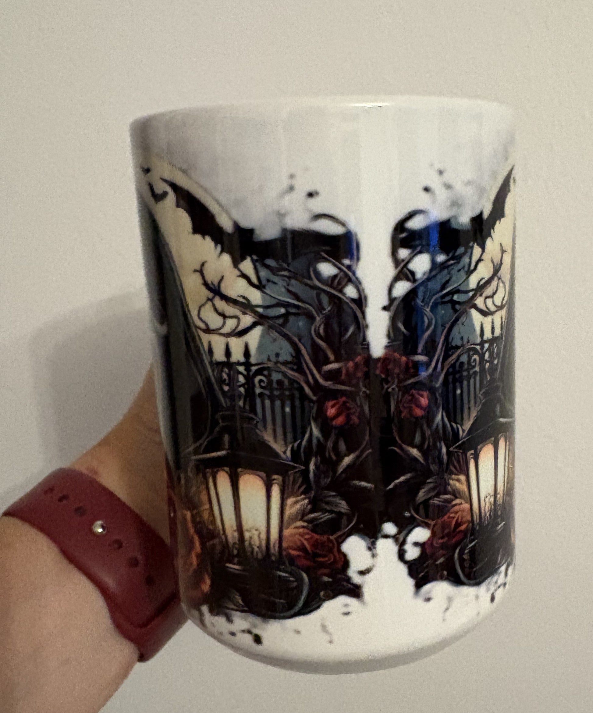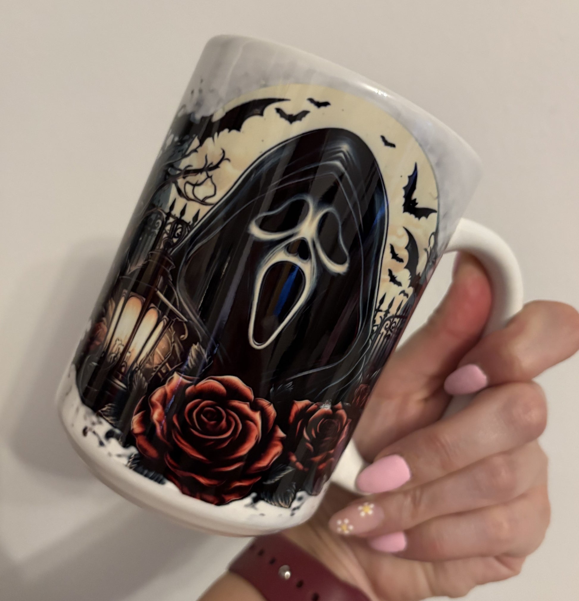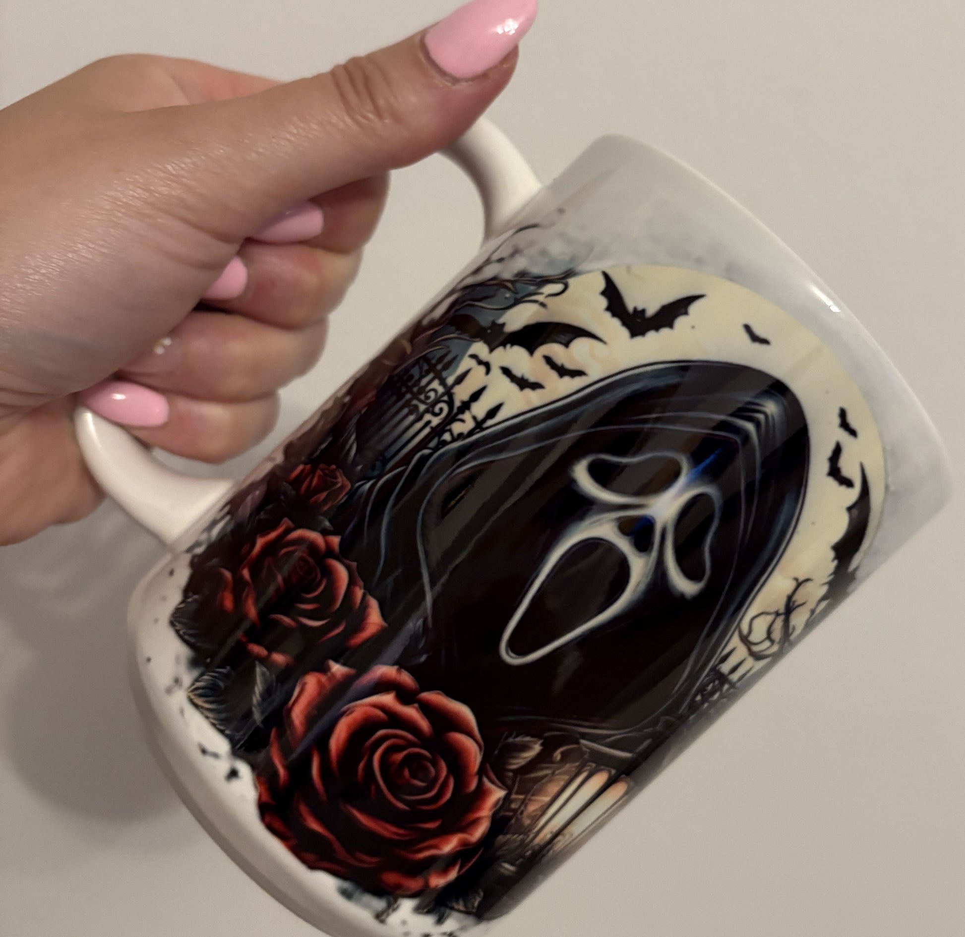 This striking 15oz mug is the perfect blend of horror and gothic romance. Crafted from high-quality ceramic, it features the iconic Ghostface mask, but with a unique and elegant twist. The design is softened by beautifully detailed roses that entwine around the figure, creating a captivating contrast between fright and beauty. It's an ideal choice for any horror fan who also appreciates a dark, artistic aesthetic. The mug is both microwave and dishwasher safe, combining a killer design with everyday functionality.