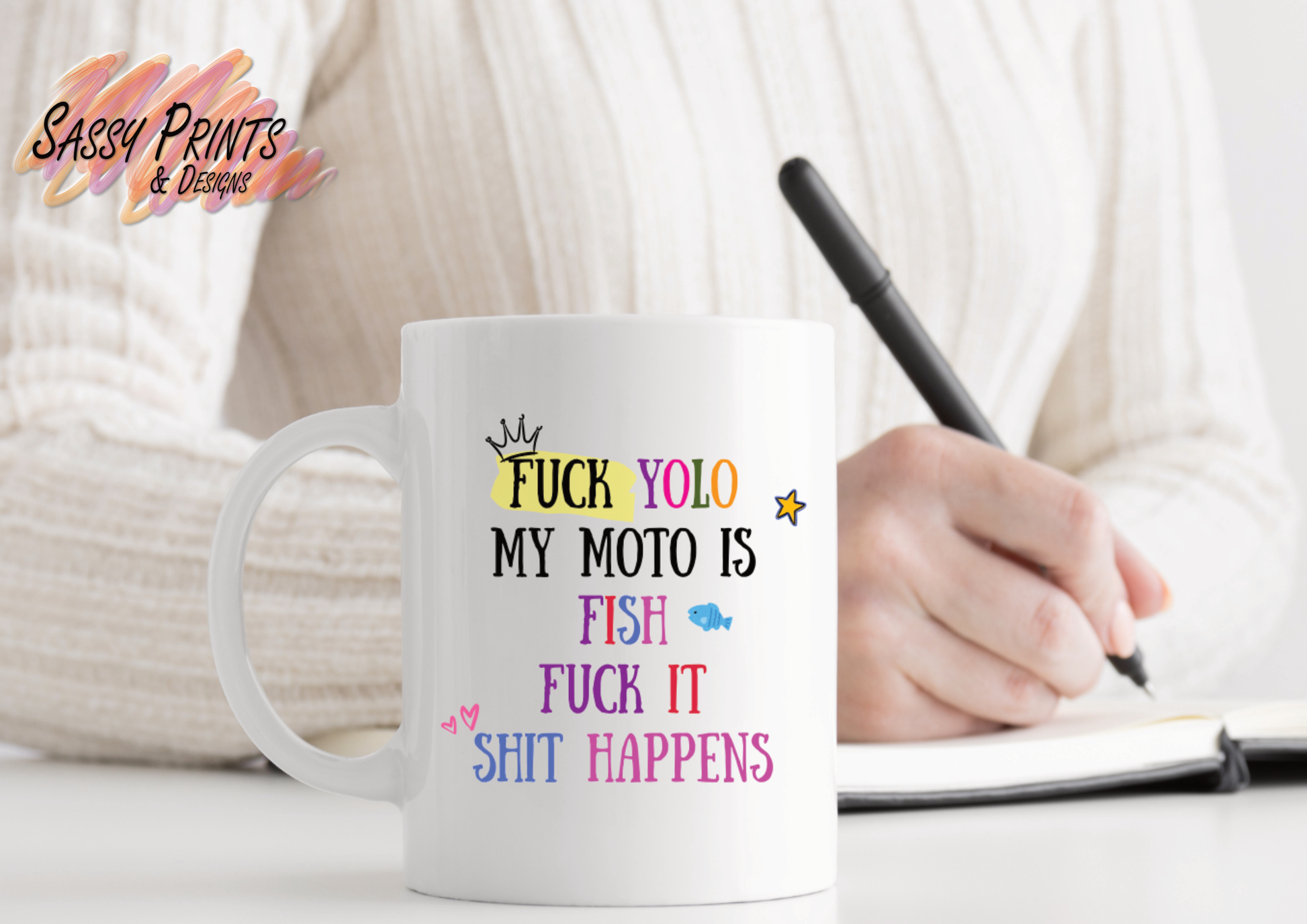 - My Moto is Fish 🐟 This unique mug features a humorous slogan: "My moto is fish fuck it shit happens." Perfect for those who appreciate a good laugh. Ideal as a gift for friends or family who share your sense of humor.