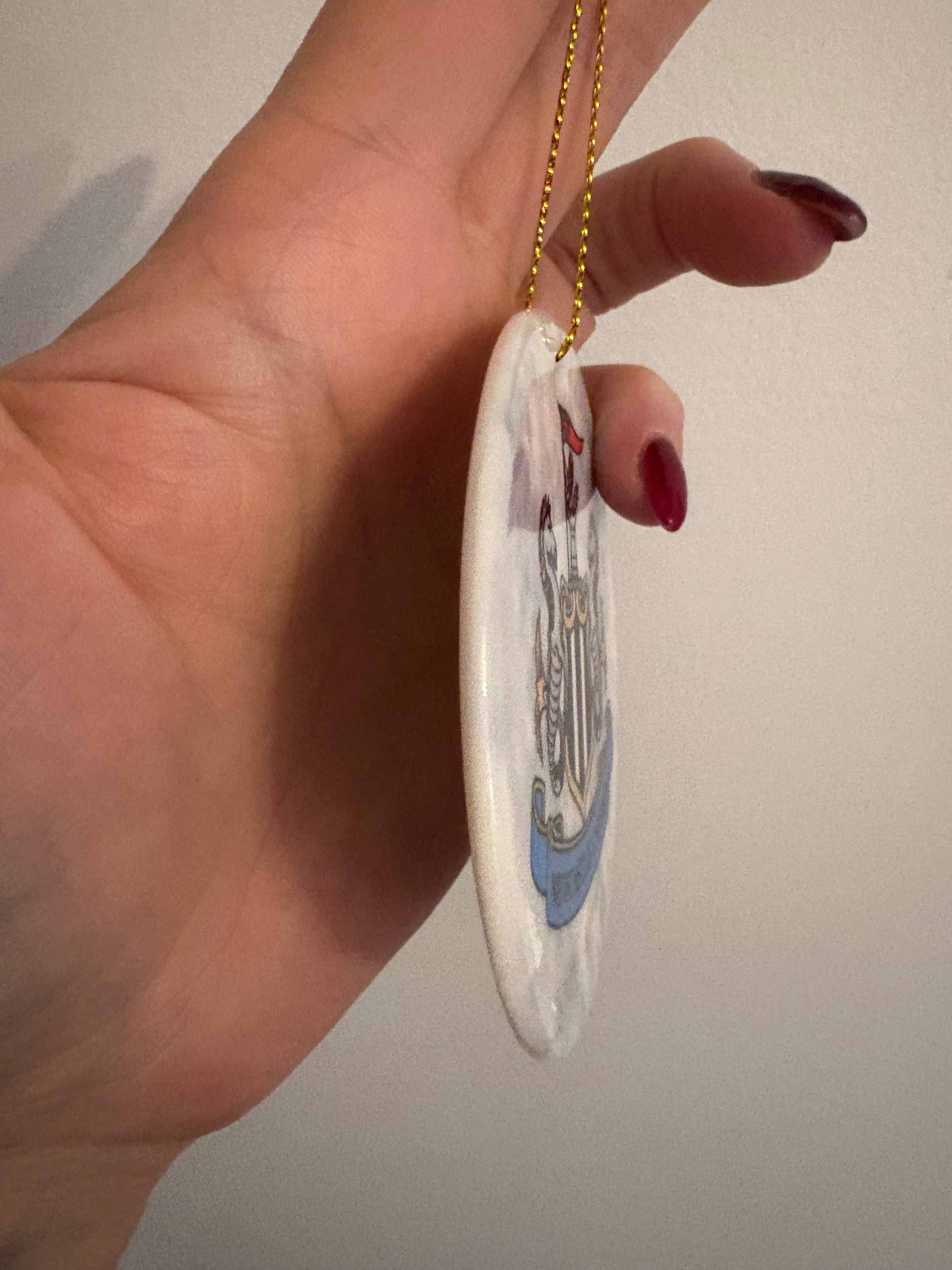 Ceramic Christmas tree ornament featuring the NUFC crest, perfect gift for fans!