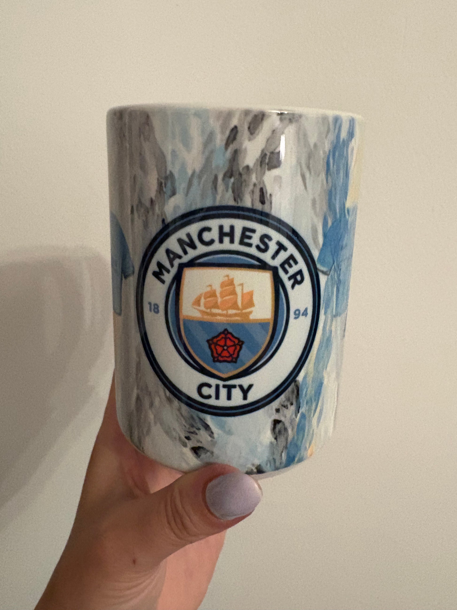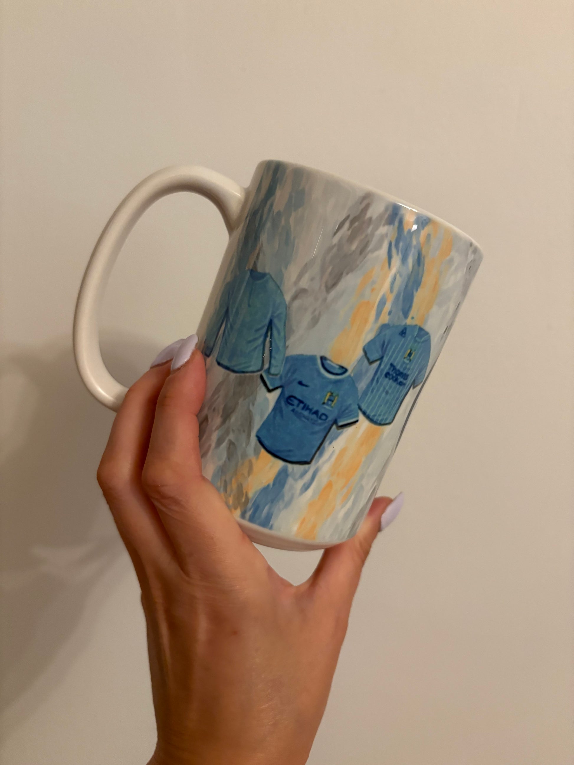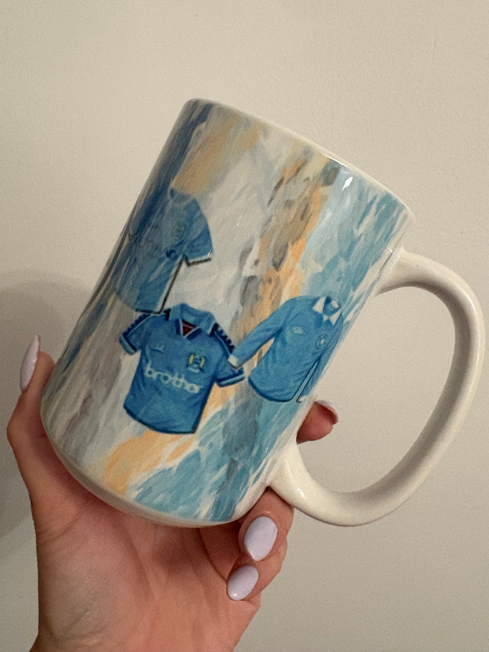 Show your support for the Citizens with this 15oz Manchester City mug, featuring a cool retro T-shirt design. The generously sized ceramic mug is perfect for a big cup of coffee or tea, and the vibrant, high-quality print celebrates the club's iconic history. It's a fantastic way for any City fan to start their day. This mug is both microwave and dishwasher safe, making it as practical as it is stylish.