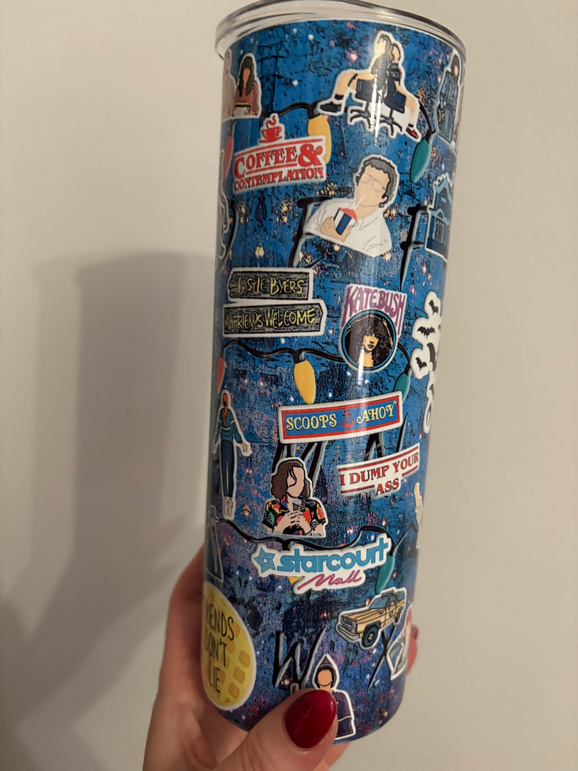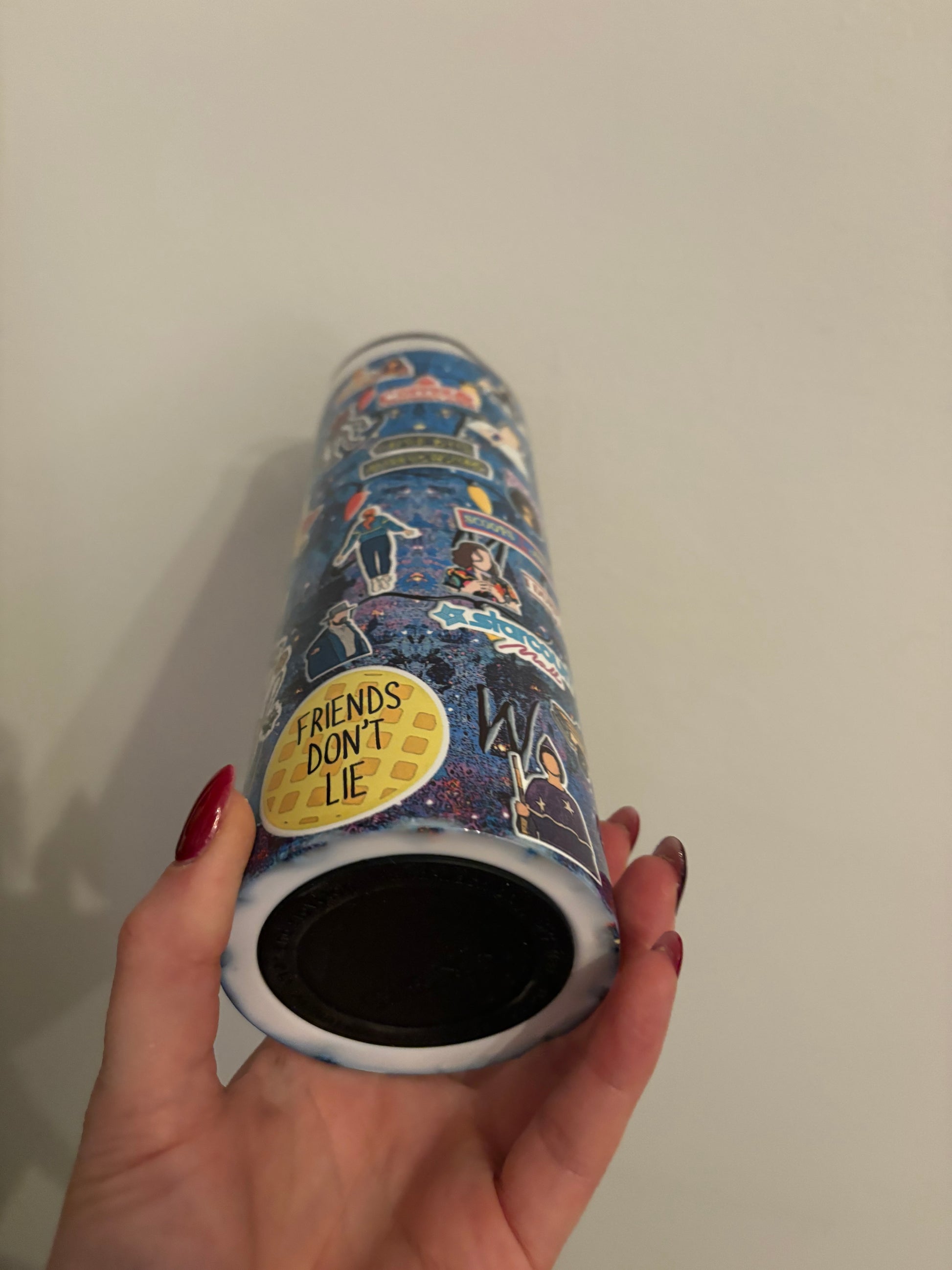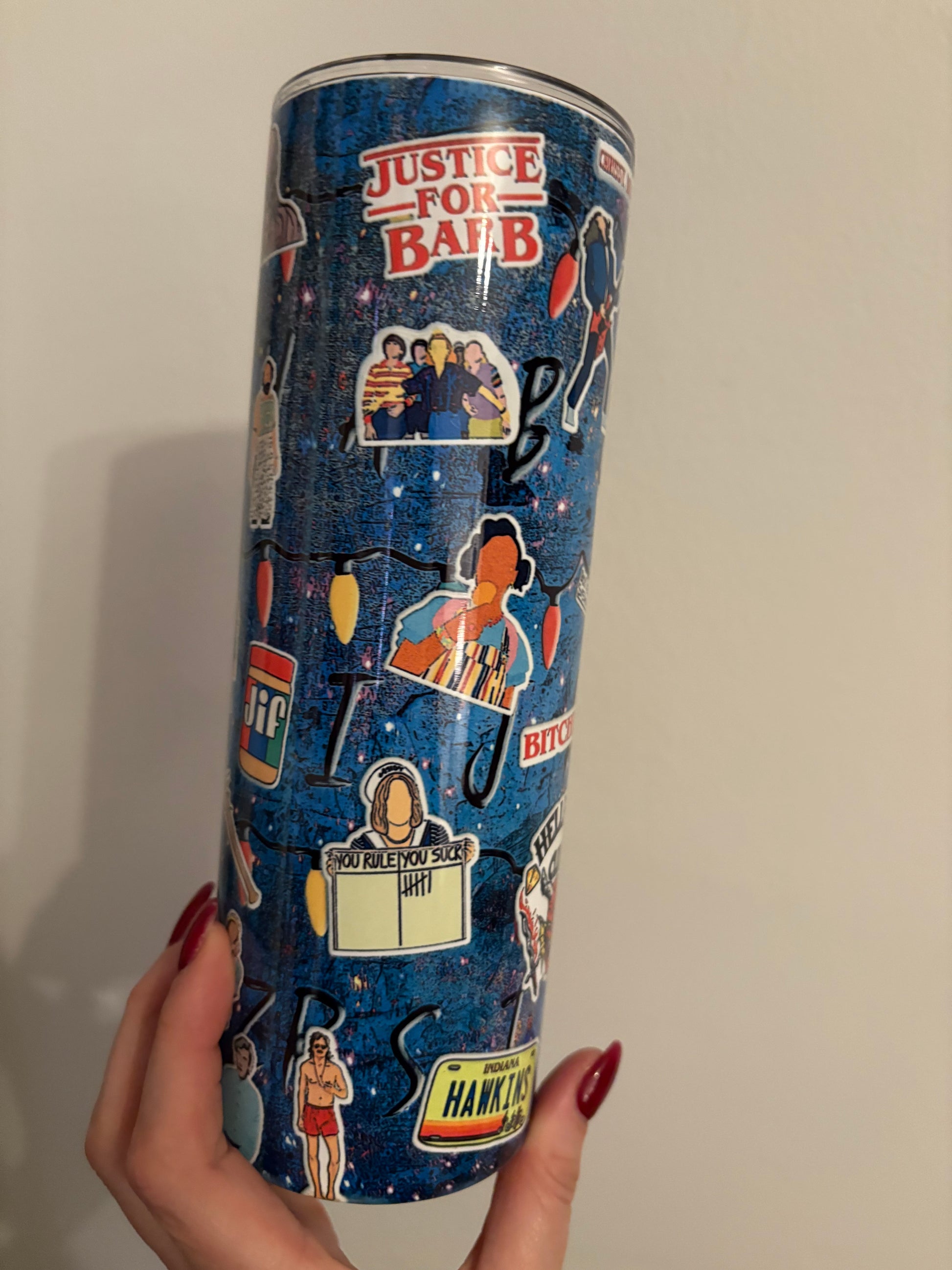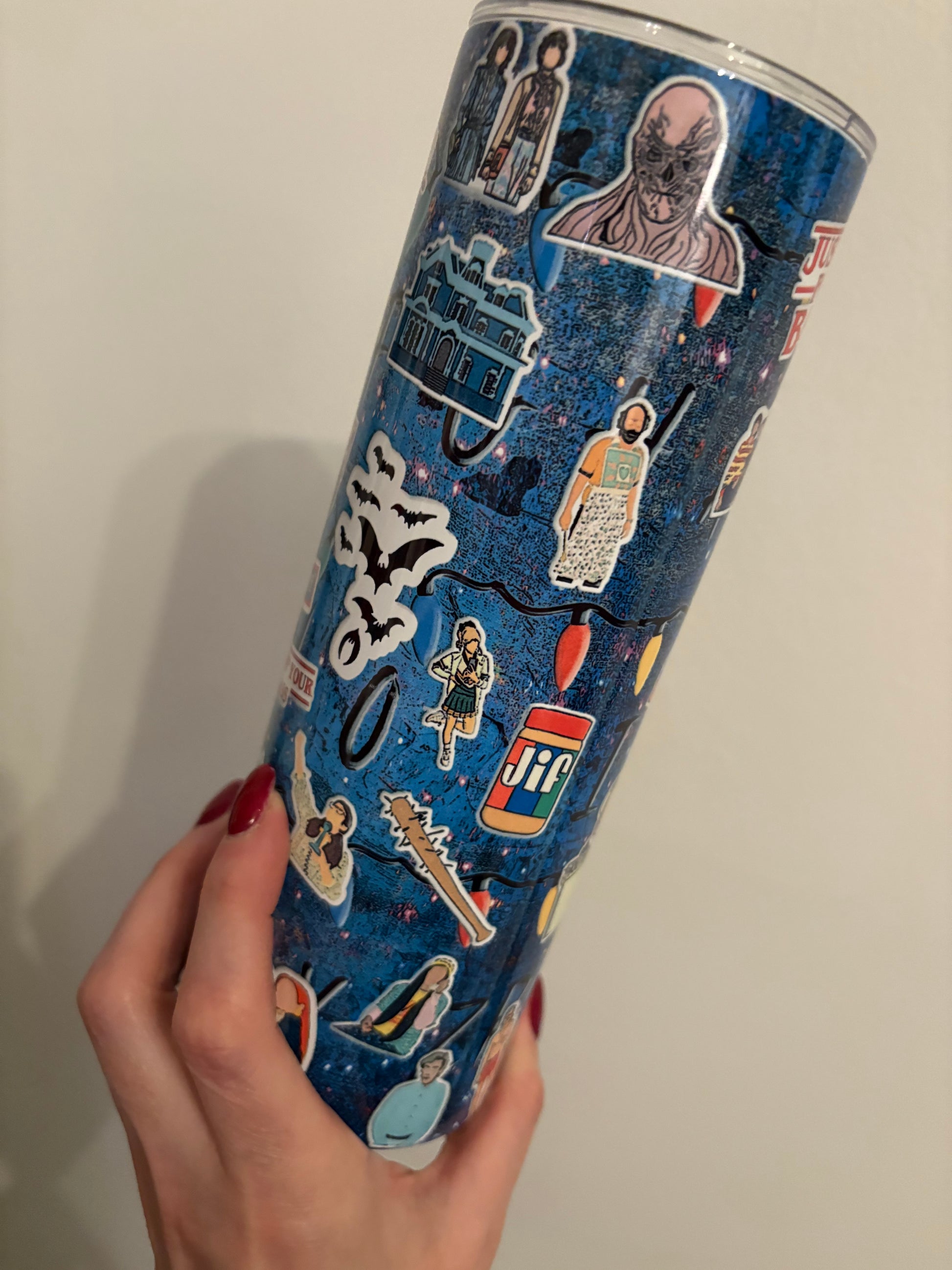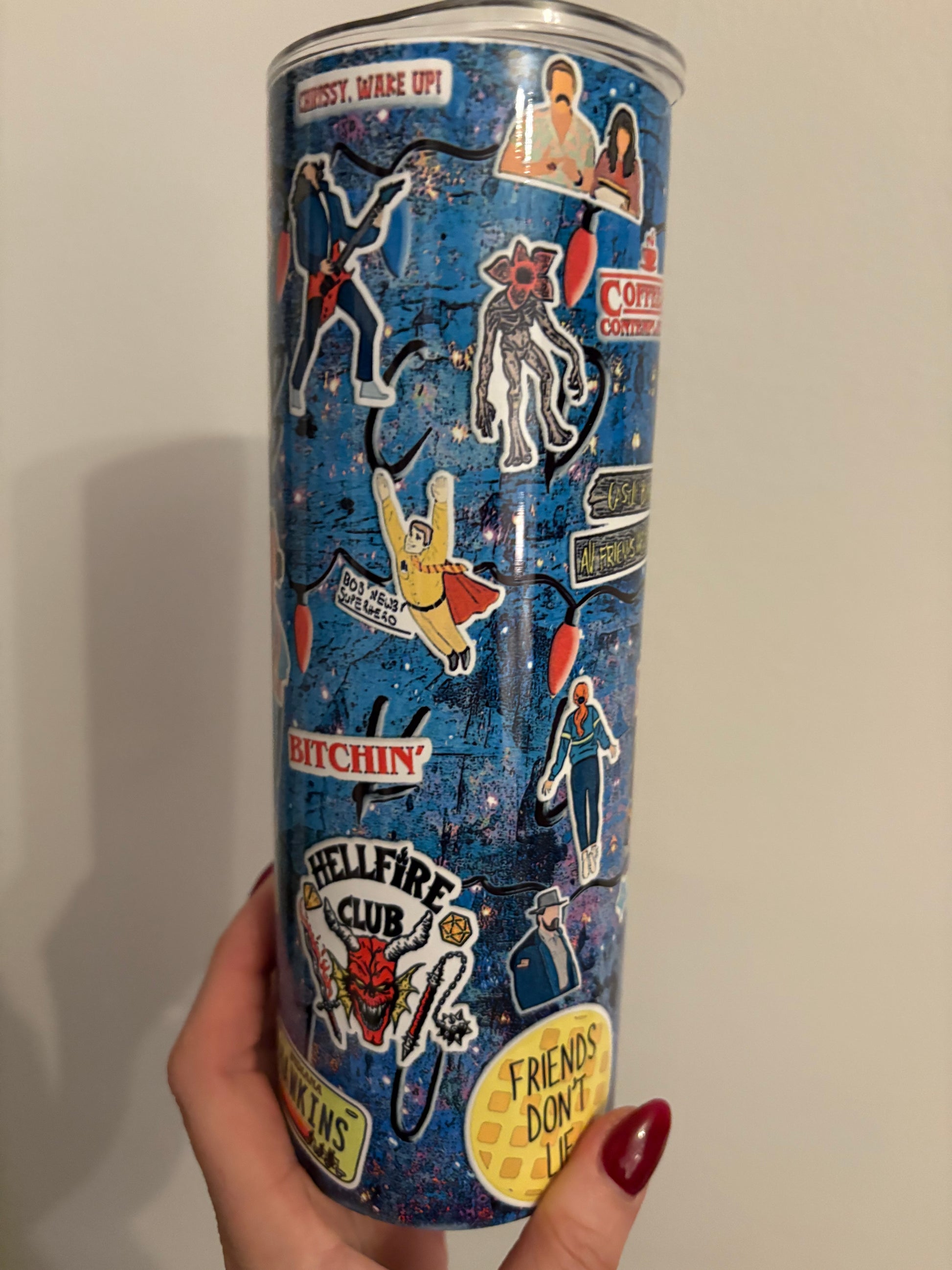 This 20oz tumbler is a deep dive into the mysteries of Hawkins! Featuring a mesmerizing collage of imagery, this cup captures the essence of Stranger Things—from the eerie glow of the Upside Down to the heroic gang of friends, and the most terrifying creatures they face. Every sip comes with a side of nostalgia and suspense. A must-have for showcasing your true fandom.